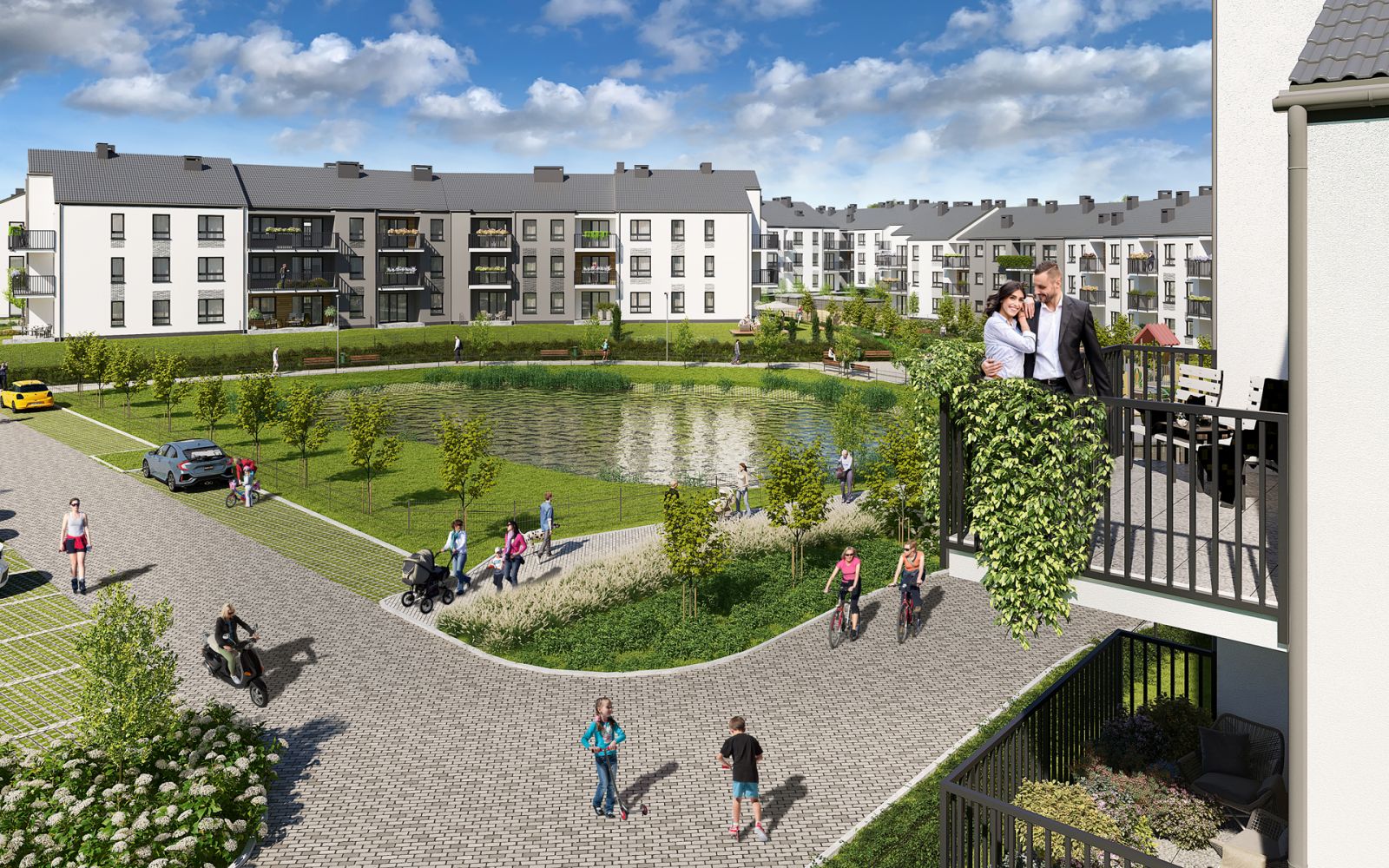 Powstające budynki skoncentrowane będą wokół istniejącego placu zabaw oraz zbiornika wodnego, przy którym zaprojektowano drugi plac zabaw. Cały kompleks stanowić będzie wspólną przestrzeń rekreacyjno – wypoczynkową dla mieszkańców wszystkich etapów osiedla. Do dyspozycji mieszkańców przewidujemy również miejsca postojowe naziemne oraz komórki lokatorskie położone na kondygnacjach mieszkalnych.