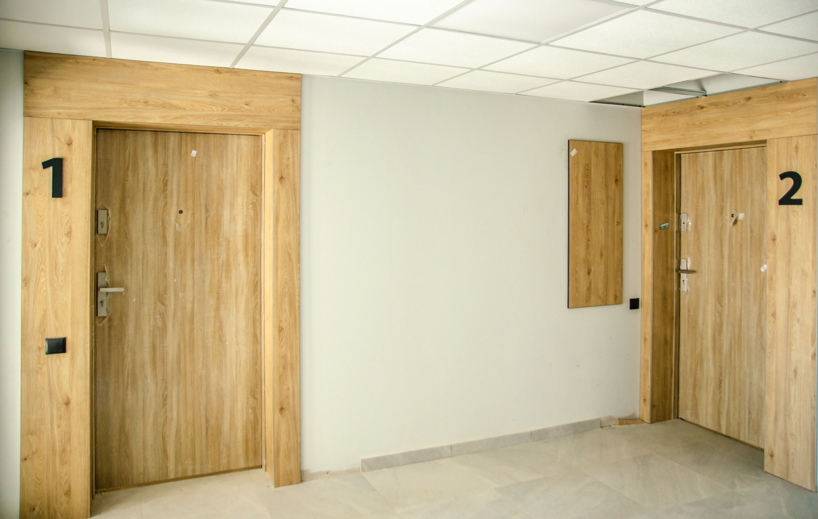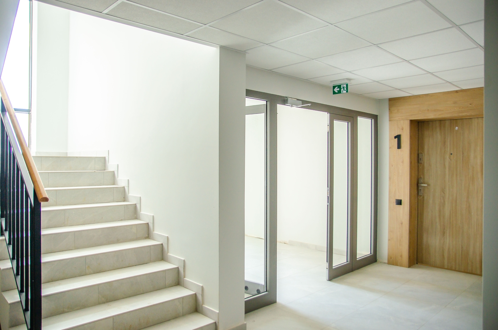 - eleganckie drzwi wejściowe do mieszkań wraz z pięknymi drewnianymi ościeżnicami