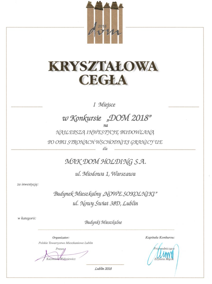 Jest nam niezwykle miło poinformować Państwa, że inwestycja Nowe Sokolniki zwyciężyła w XVIII edycji konkursu o Kryształową Cegłę 2018 w kategorii "Budynki mieszkalne".
