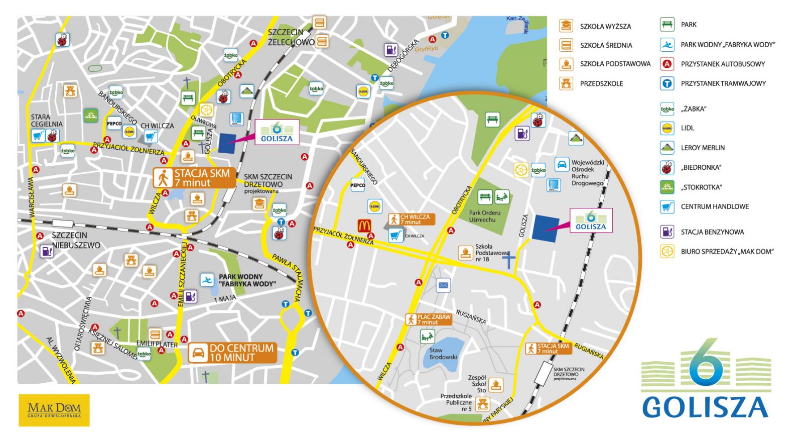 „Golisza 6” to także lokalizacja w dzielnicy, która już teraz zapewnia mieszkańcom wszystko, co niezbędne do codziennego życia. Kilka minut spaceru dzieli je od Centrum Handlowego „Wilcza” oraz dyskontów. Równie blisko jest do przedszkola i szkoły podstawowej. Idealnym celem na spacer jest pobliski Staw Brodowski. Osiedle sąsiaduje też z wiekowym Parkiem Orderu Uśmiechu. W kwadrans dojdziemy do Fabryki Wody - ogromnego aquaparku z basenami, zjeżdżalniami i jednym z największych w kraju saunariów. Ta niezwykła atrakcja, która będzie gotowa już w 2023 roku, powstaje na terenach dawnej Gontynki.