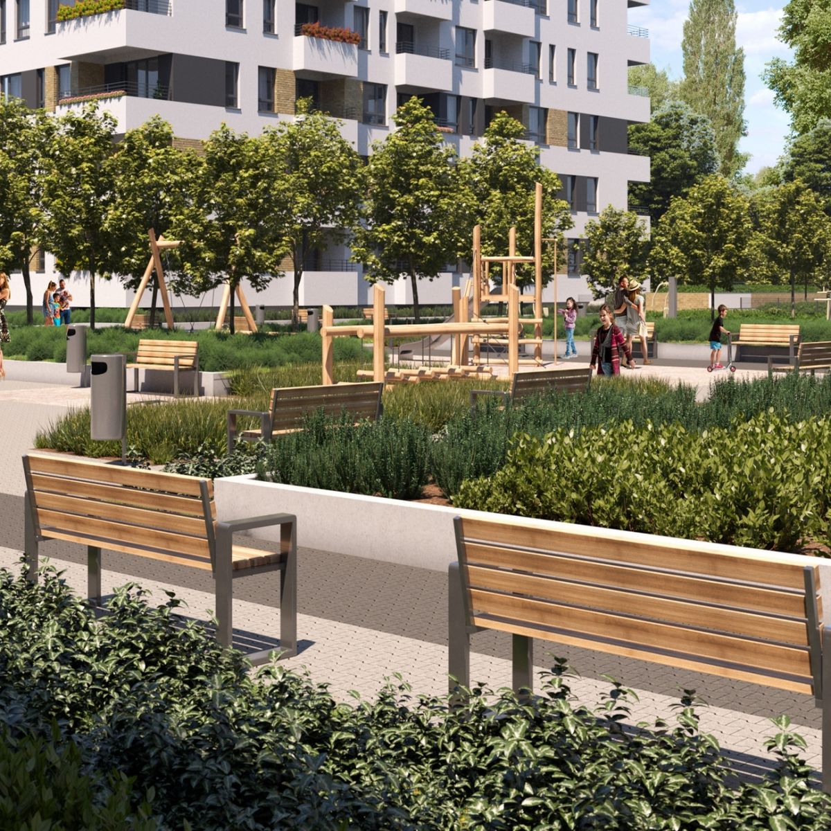 Wspólny teren zostanie atrakcyjnie zagospodarowany. W strefie rekreacji mieszkańcy otrzymają plac zabaw dla dzieci, strefę sportową z dwoma stołami do ping-ponga oraz stołem do gry w piłkarzyki. Będą też ławki do wypoczynku oraz doskonale wkomponowana w całość zróżnicowana i bogata zieleń.