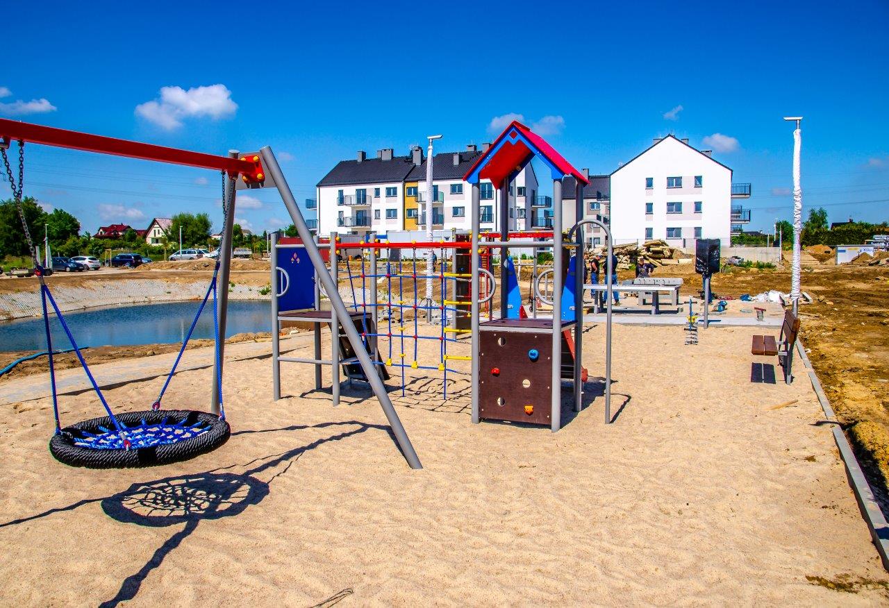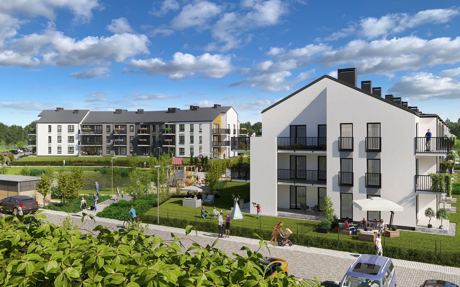 Powstające budynki skoncentrowane będą wokół istniejącego placu zabaw oraz zbiornika wodnego, przy którym zaprojektowano drugi plac zabaw. Cały kompleks stanowić będzie wspólną przestrzeń rekreacyjno – wypoczynkową dla mieszkańców wszystkich etapów osiedla. Do dyspozycji mieszkańców przewidujemy również miejsca postojowe naziemne oraz komórki lokatorskie położone na kondygnacjach mieszkalnych.